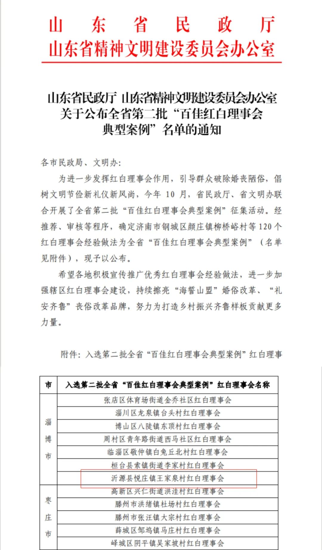 沂源融媒讯:近日,山东省民政厅、山东省精神文明建设委员会办公室联合公布全省第二批“百佳红白理事会典型案例”名单,沂源县悦庄镇王家泉村红白理事会入选。